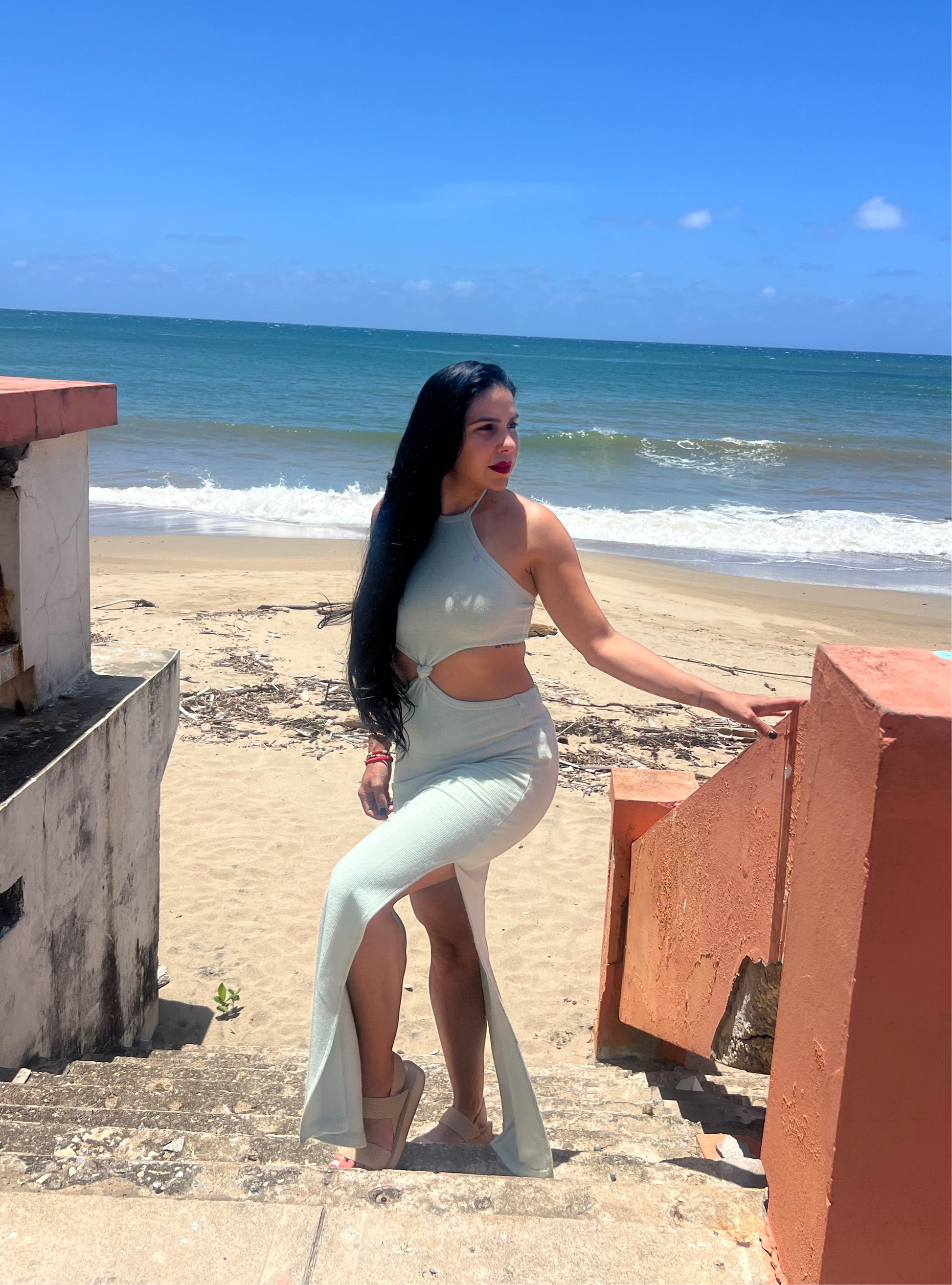 Sleeveless cutout detail halter knit midi dress with side leg slits.